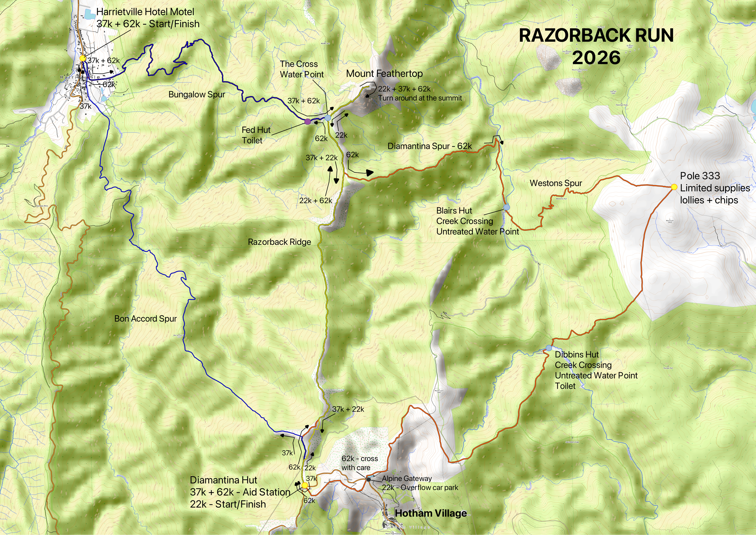 Aid Station: One aid station only located at Diamantina Hut - 23km into the race. Cut off here is 8 hours - 3:00pm